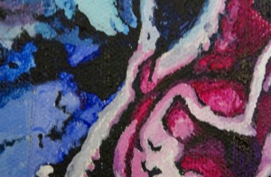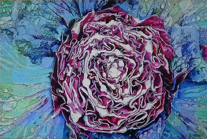 One morning when I went out to inspect my vegetable garden, I noticed that a deer had gotten in and sampled the veggies. This is an image of what one of my red cabbages looked like. I had always loved the colors, and curls that presented themselves when I sliced into a cabbage and so I decided to paint it.